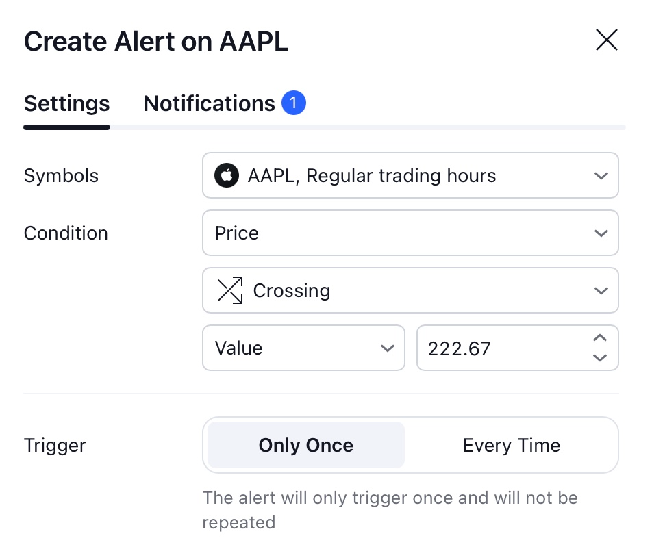 일반 가격 기반 얼러트에는 한 번만 및 매번의 두 가지 옵션을 사용할 수 있습니다.