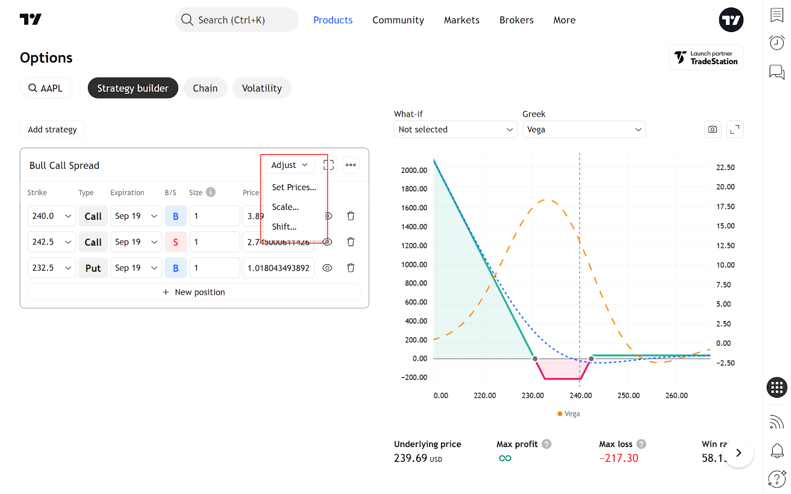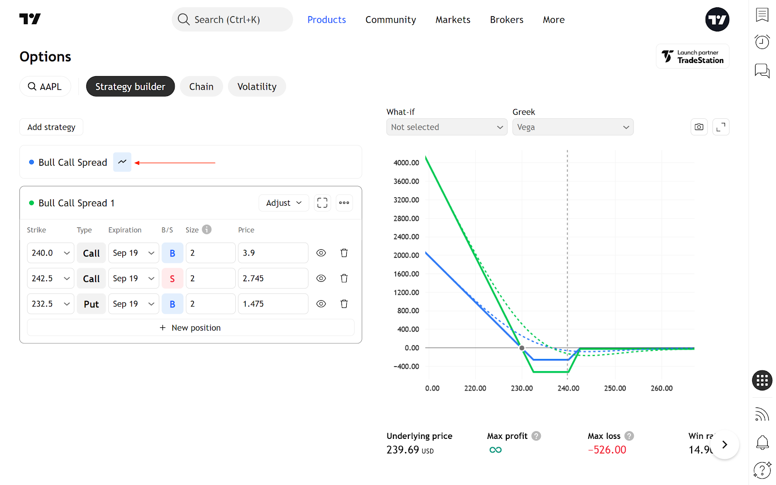 차트는 TradingView 옵션의 핵심입니다. 주요 목적은 전략 매개변수(P&L 및 그릭스)가 기초자산 가격에 어떻게 의존하는지 시각화하는 것입니다. X축은 기초자산 가격을 표시합니다.