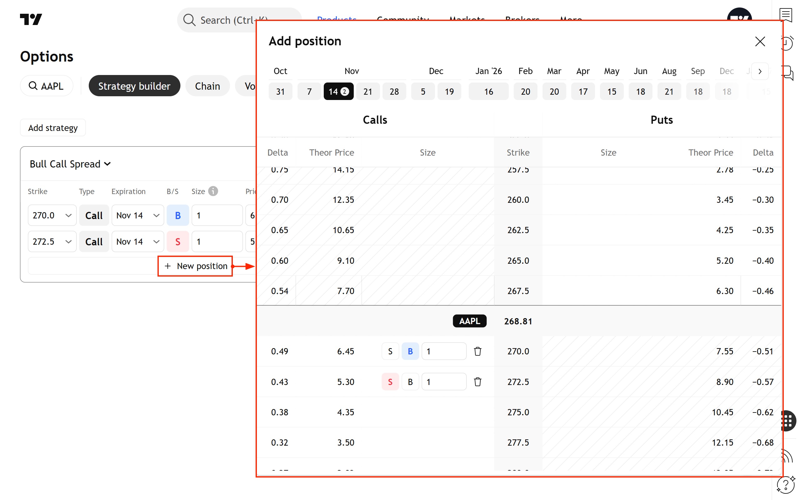 가장 먼저 시도해 볼 작업은 전략에 새로운 포지션을 추가하는 것입니다. 포지션 테이블 아래의 “+ 새 포지션” 버튼을 클릭하세요. 옵션 체인의 특수 버전이 포함된 대화 상자가 나타납니다. 이 체인에는 일반 체인에서 제공되는 대부분의 데이터가 포함되어 있지 않습니다. 대신 기존 포지션을 표시하고 추가 또는 제거할 수 있는 ‘규모(Size)’ 열이 있습니다.