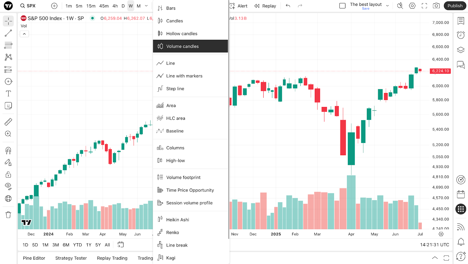 앞서 언급한 바와 같이, 이 두 차트 유형의 유일한 차이점은 거래량 캔들은 몸체의 두께가 다르게 표시된다는 것입니다.
