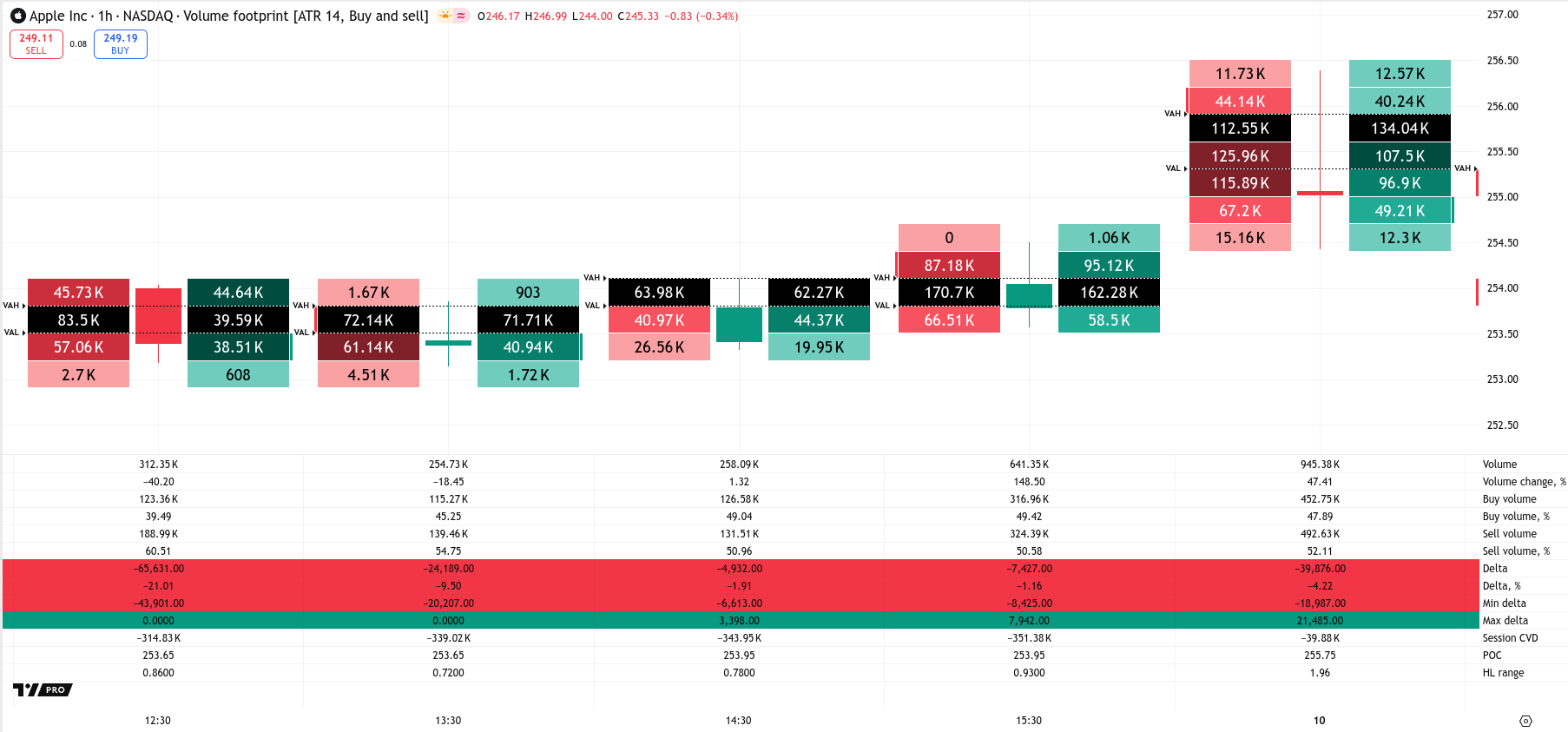 볼륨 풋프린트 차트는 바 내 가격 변동 방향에 따라 거래량을 “매수” 또는 “매도”로 분류합니다.