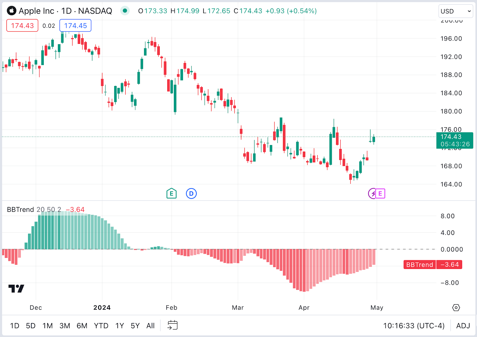 BBTrend 지표는 계산 결과를 히스토그램 형태로 표시합니다. BBTrend 값이 0보다 높으면 상승 추세를, 0보다 낮으면 하락 추세를 나타냅니다. 값이 0에서 얼마나 멀리 떨어져 있는지는 추세의 강도 또는 모멘텀을 반영합니다.