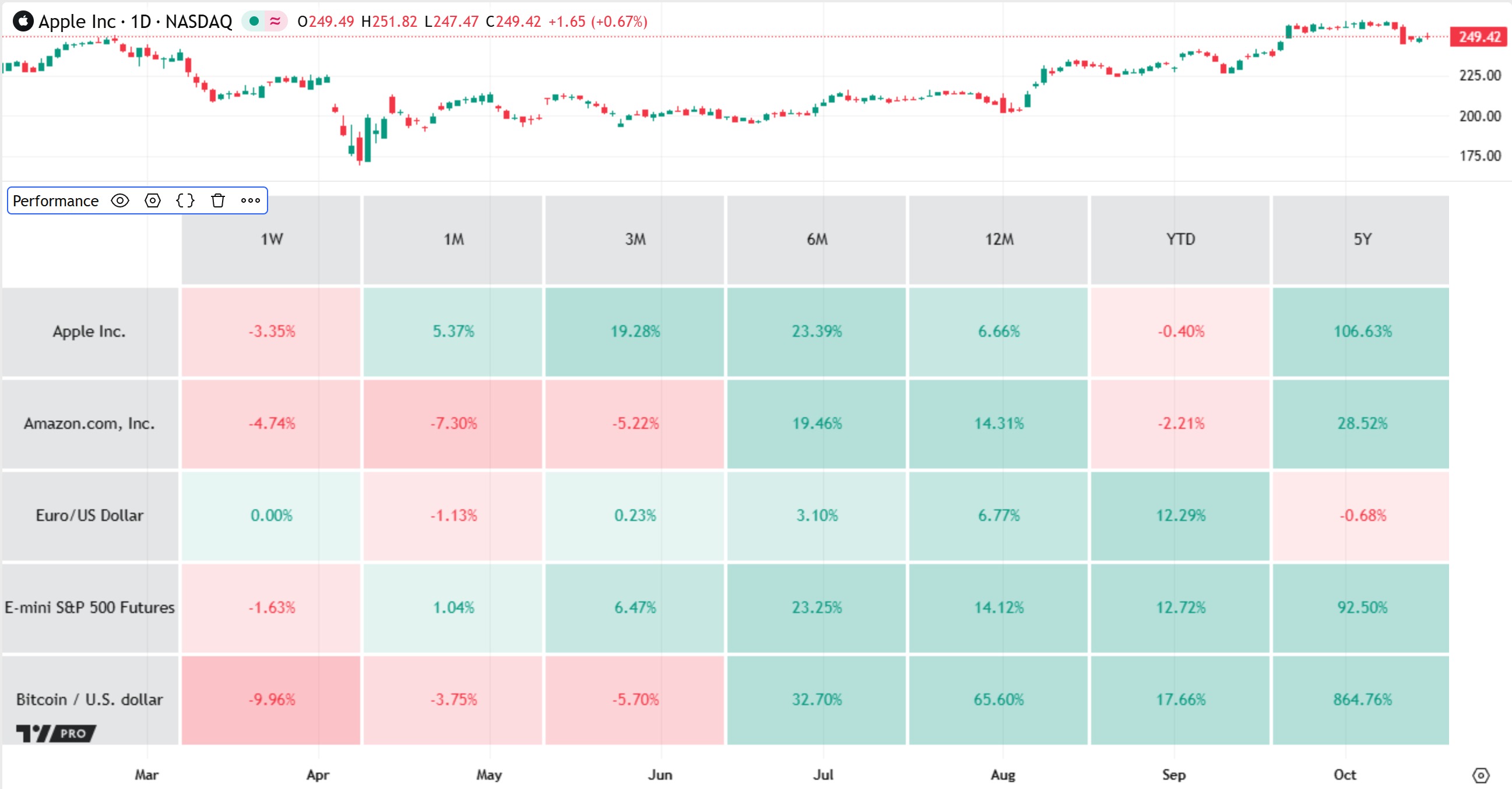 예를 들어, 해당 심볼의 최신 가격이 215.00이고 “1M” 앵커 바의 종가가 193.00인 경우, 결과 성과 값은 100 * (215 - 193) / 193 = 11.40%입니다. 이 값은 해당 심볼의 가격이 최근 한 달 동안 11% 이상 상승했음을 나타냅니다.
