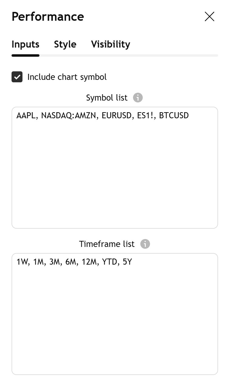 성과 인디케이터는 선택한 일련의 기간 동안 하나 이상의 심볼 가격의 현재 백분율 변동을 히트맵 스타일 테이블로 표시합니다. 이 인디케이터에는 쉼표로 구분된 목록을 입력하여 성능 데이터를 표시할 심볼과 타임프레임을 커스텀할 수 있는 텍스트 입력란이 있습니다.