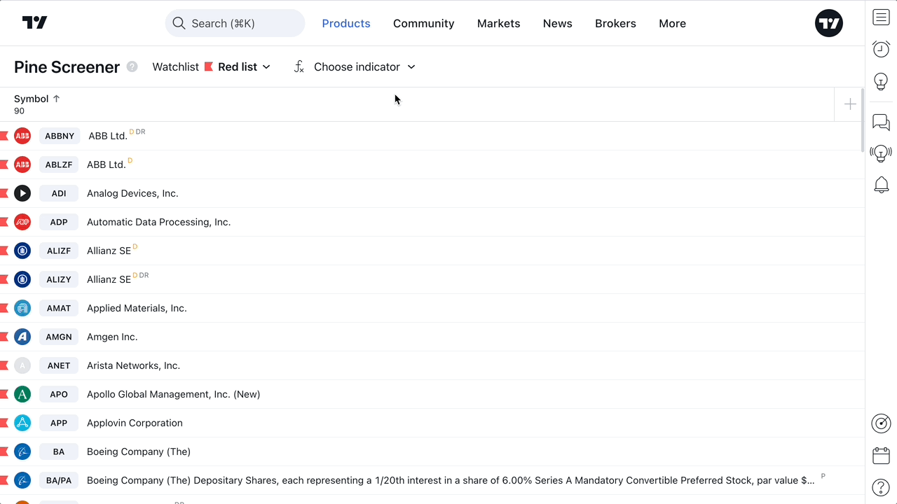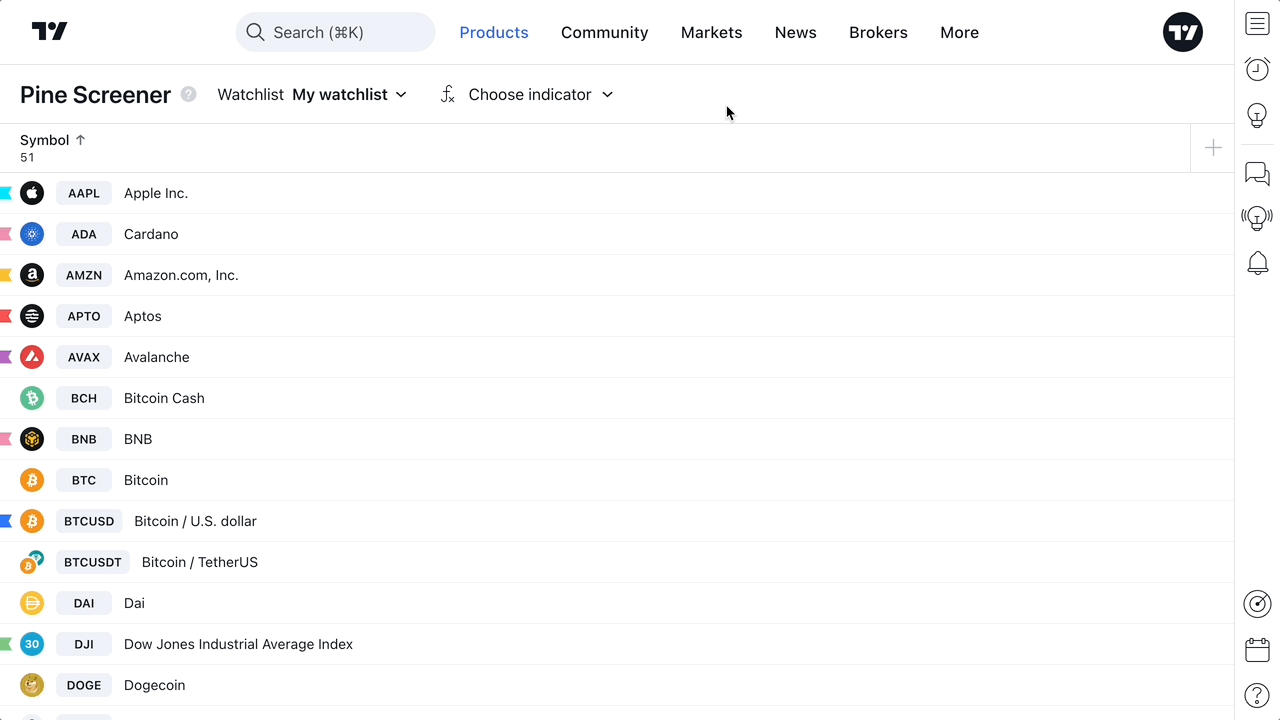 심볼 유형에 관계없이 전체 심볼 세트로 작업할 수 있습니다. 파인 스크리너는 주식, 암호화폐 심볼, 채권 및 기타 자산이 포함된 전체 왓치리스트를 스캔할 수 있습니다.