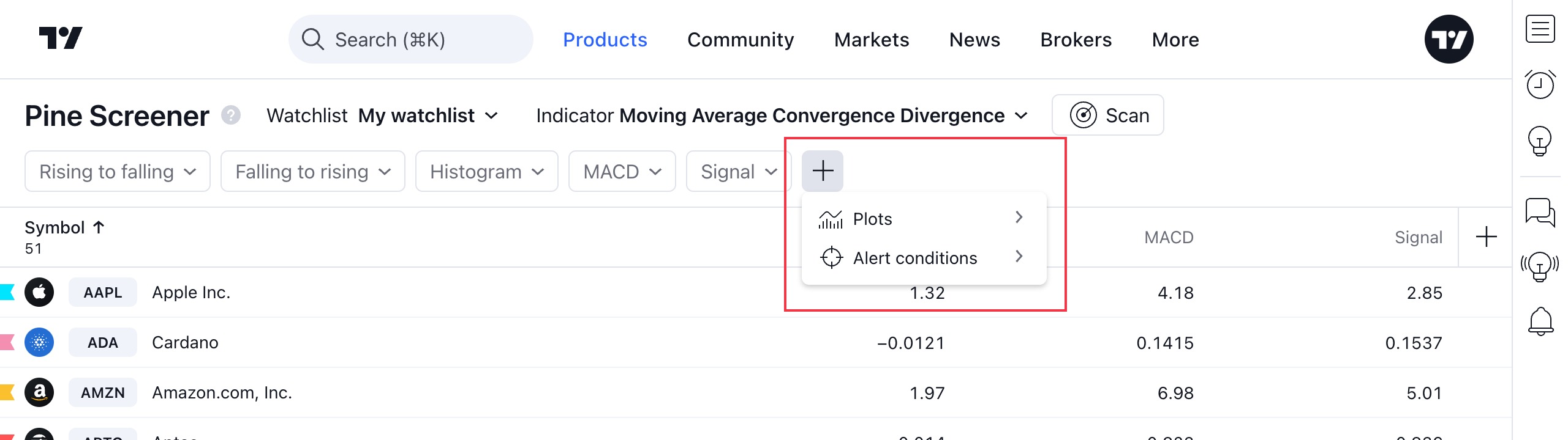 Pine Script®로 만든 인디케이터가 있는 경우 스크리너에 포함시켜 고유한 트레이딩 뷰의 관점에서 즐겨 찾는 자산이 어떻게 보이는지 확인할 수 있습니다.