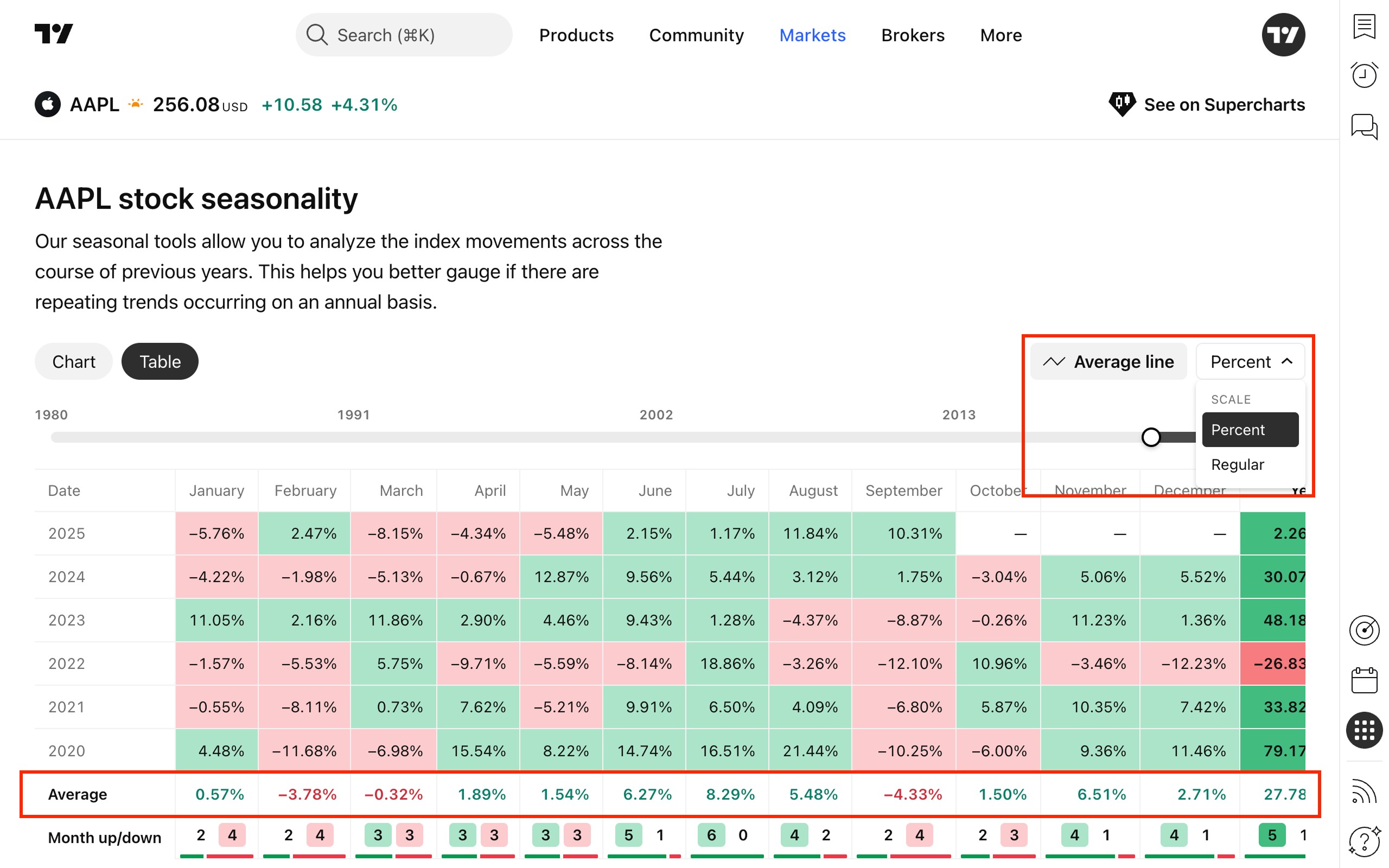 또한 시즈널을 테이블로 표시하는 기능도 있습니다. 테이블에서 각 행은 1년 단위를 나타내며, 각 셀은 특정 월의 가격 변동을 보여줍니다. 셀의 색상은 한눈에 추세를 파악하기 쉽게 해줍니다: 녹색은 긍정적인 변화를, 빨간색은 부정적인 변화를 강조합니다. 테이블 하단에는 각 연도별 긍정적 및 부정적 월의 분포를 보여주는 요약 행도 확인할 수 있습니다.