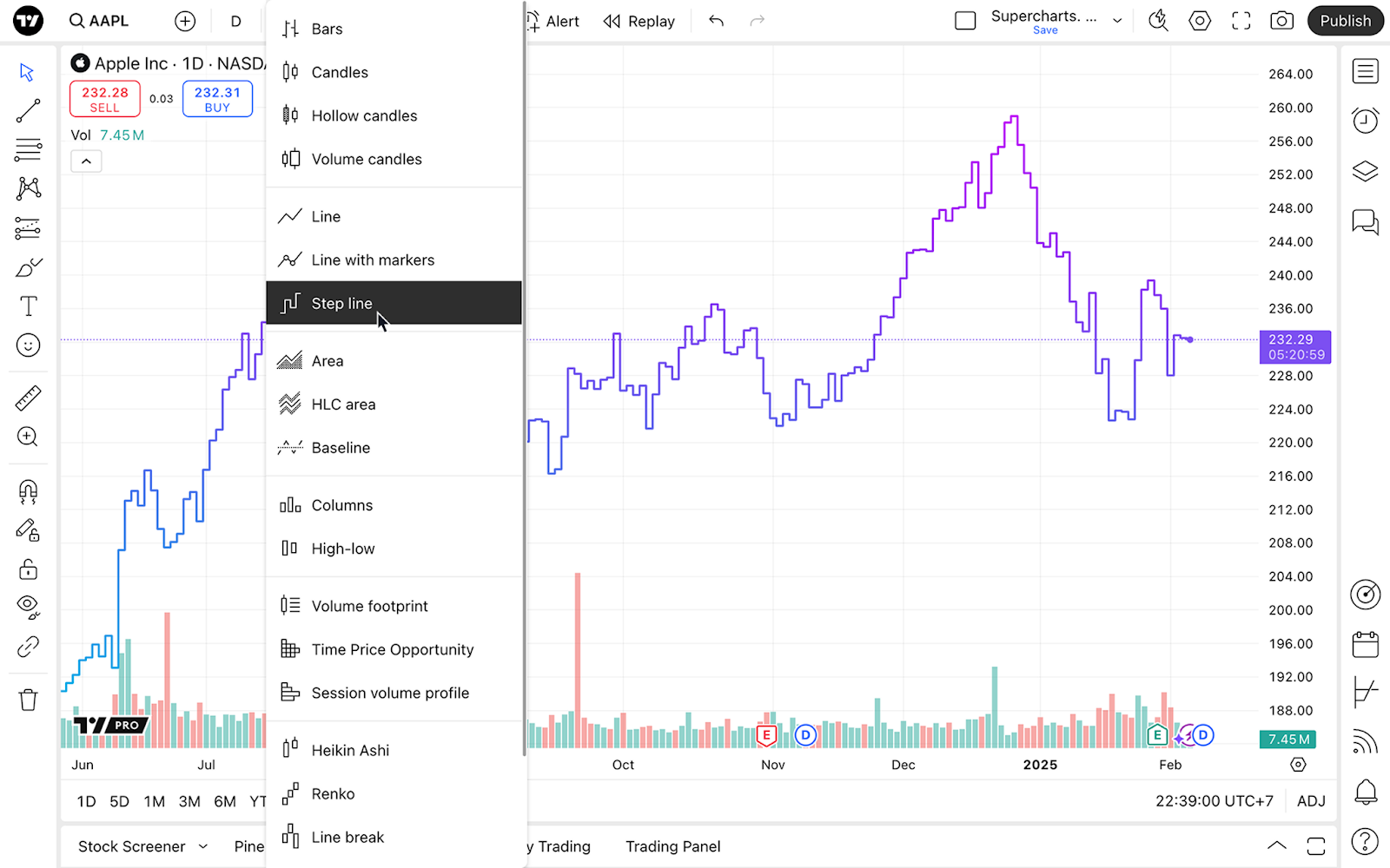 Supercharts로 이동한 후, 상단 툴바에서 차트 유형 메뉴를 열고 “스텝 라인”을 선택합니다.