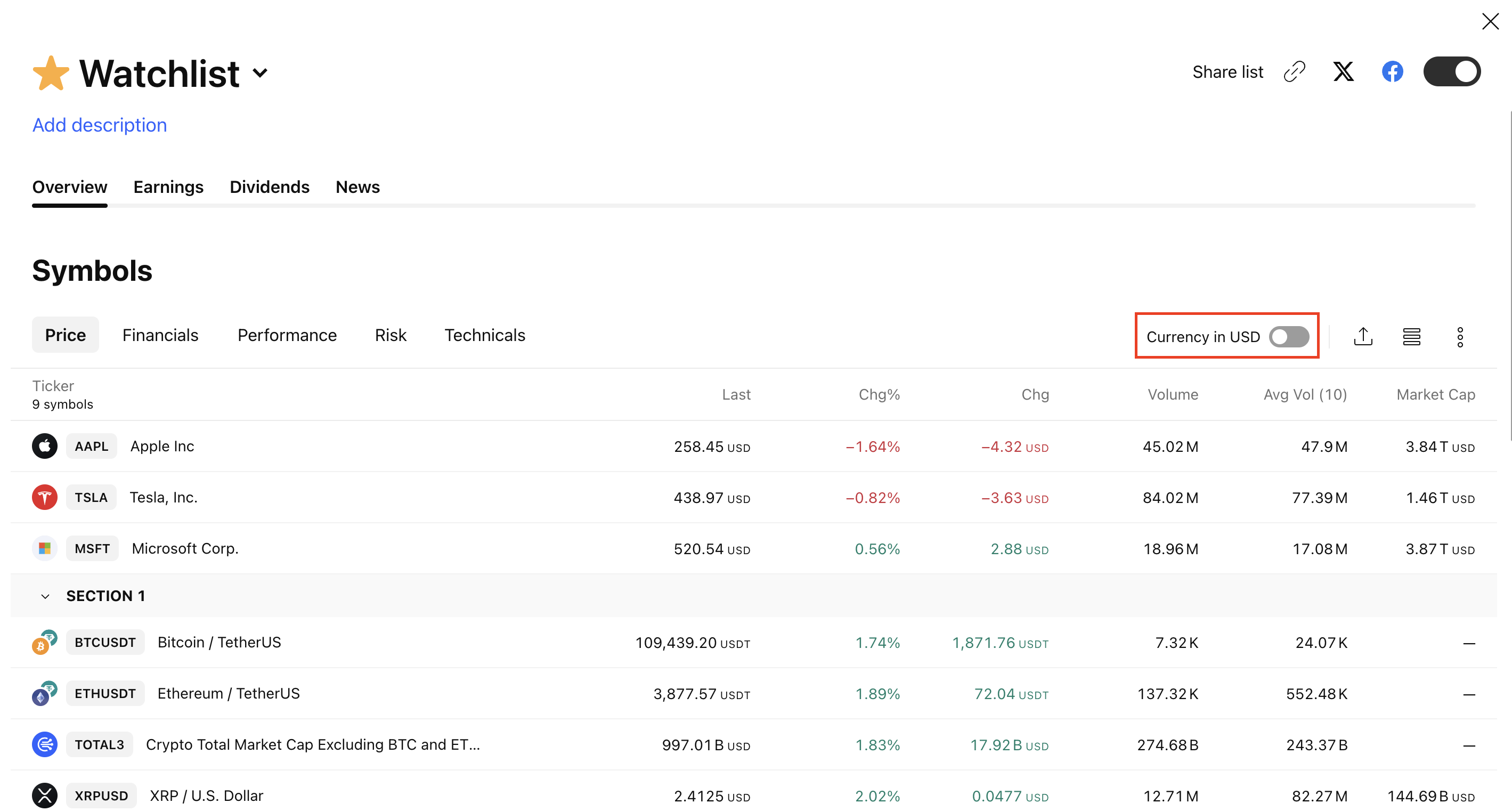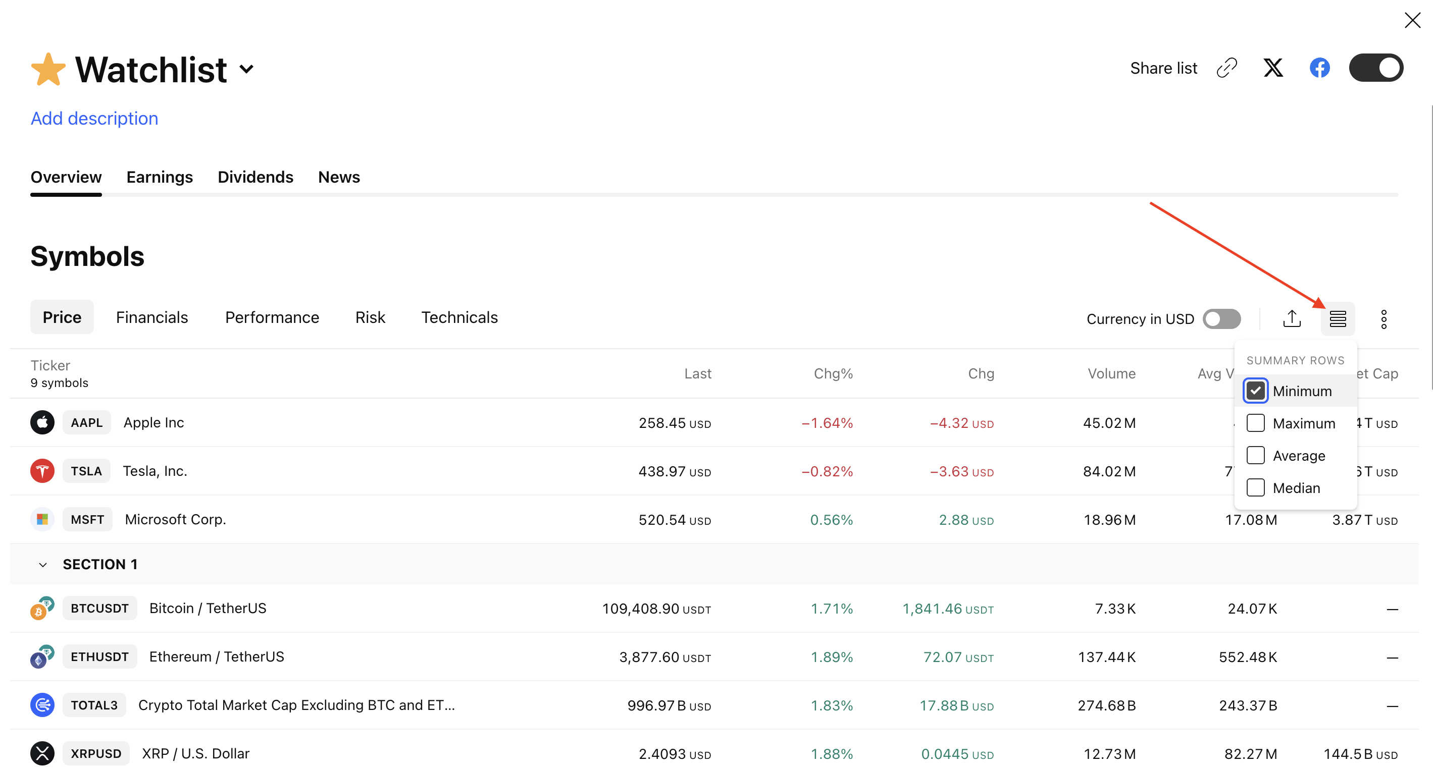보기를 선택했으면 이제 심볼을 추가할 차례입니다. 더하기 버튼을 클릭하여 심볼 검색을 엽니다. 다양한 사용자 지정 옵션을 사용하여 중요한 변경 사항을 놓치지 않도록 목록을 체계적으로 정리할 수 있습니다