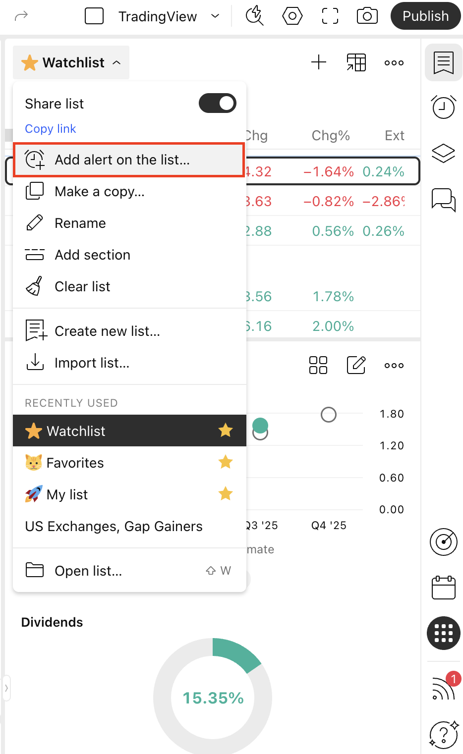 여기서도 왓치리스트를 생성하거나 컴퓨터에서 가져올 수 있습니다.모든 왓치리스트를 확인하려면 설정 메뉴에서 ‘목록 열기...'를 클릭하세요.해당 메뉴에서 개인 왓치리스트나 '볼륨 증가 종목’, ‘갭 손실 종목’ 같은 좋아하는 사전 설정된 컬렉션을 열 수도 있습니다.