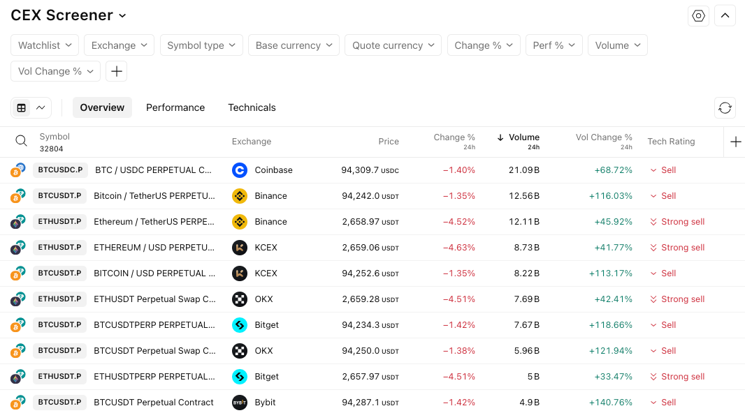 TradingView에서 이용 가능한 모든 중앙화 거래소에서 거래되는 현물 페어, 선물, 영구 계약을 포함하는 СEX 스크리너입니다.