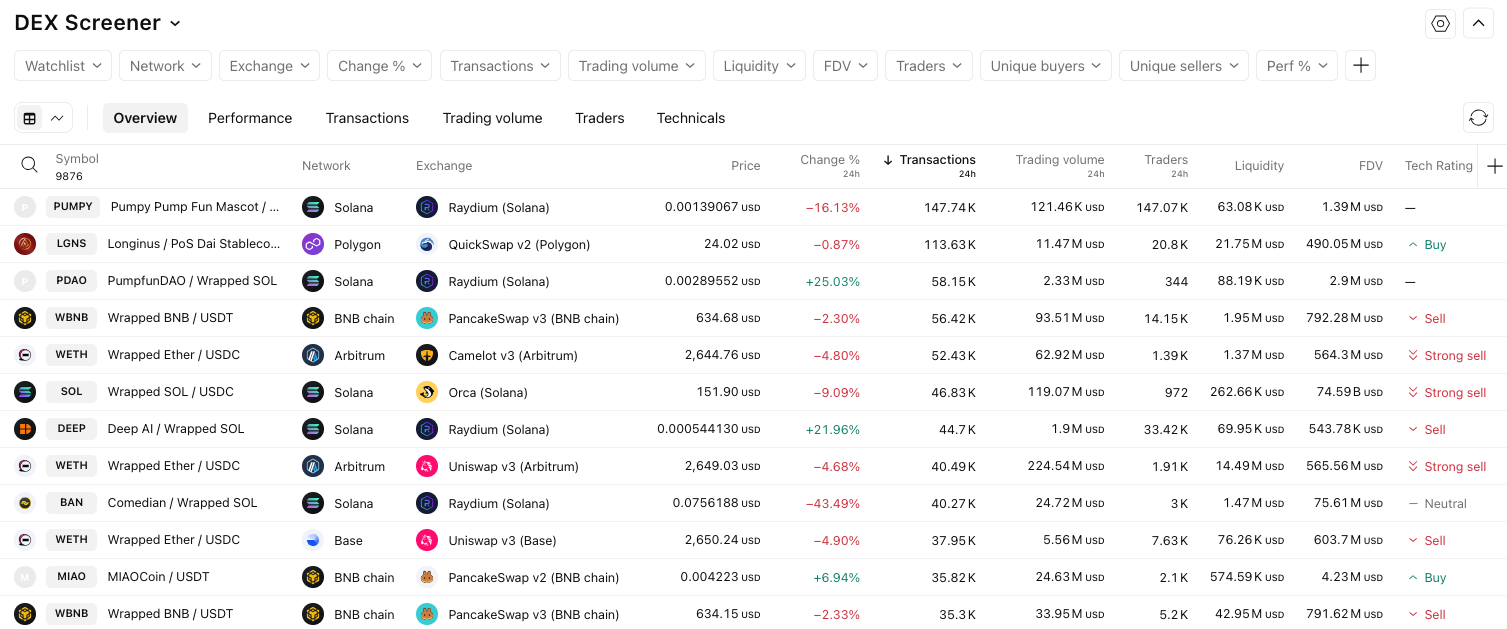 DEX 스크리너는 탈중앙화 거래소의 거래 쌍을 포함합니다. CEX 스크리너와의 주요 차이점은 이 스크리너가 탈중앙화 거래소 네트워크(및 토큰), 토큰 시가총액, 풀 유동성, 기술 지표, 거래 활동 관련 다양한 데이터(예: 고유 구매자 및 판매자 수, 구매 및 판매 거래 수, 구매 및 판매 거래량, 풀별 온체인 활동 데이터 등)로 필터링한다는 점입니다.