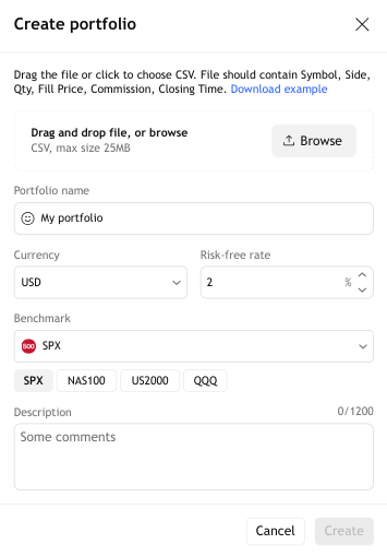 클릭하면 새 포트폴리오의 설정과 거래가 포함된 CSV 파일을 업로드할 수 있는 옵션이 있는 팝업 창이 열립니다.