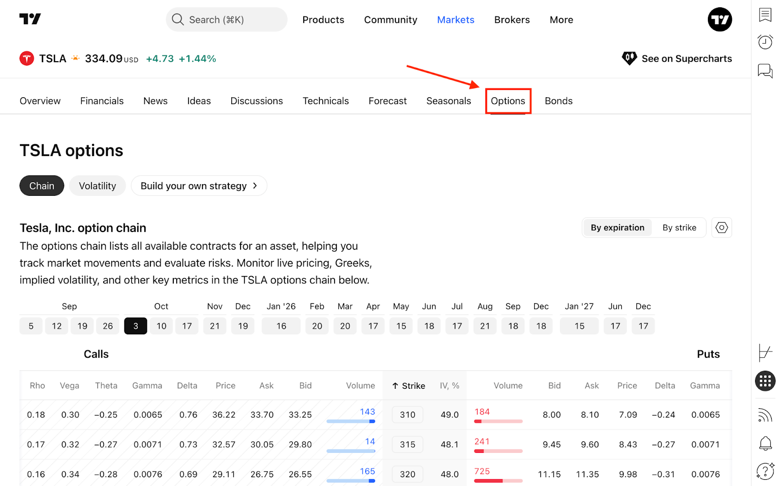 체인에 접근할 수 있는 또 다른 장소는 심볼 페이지입니다. 예를 들어 TSLA 심볼을 탐색 중이며 테슬라 옵션을 확인하려면 “옵션” 탭으로 이동하여 아래로 스크롤하세요.