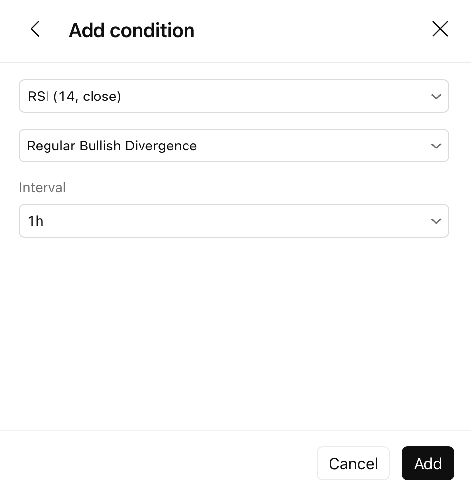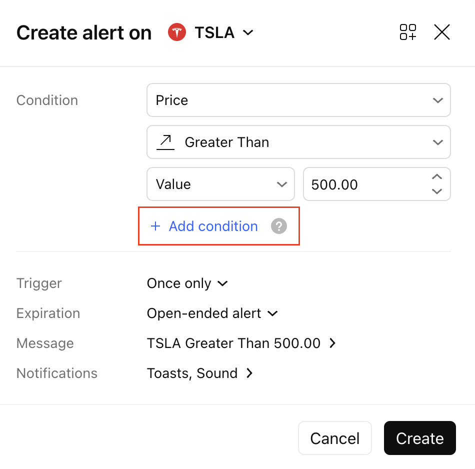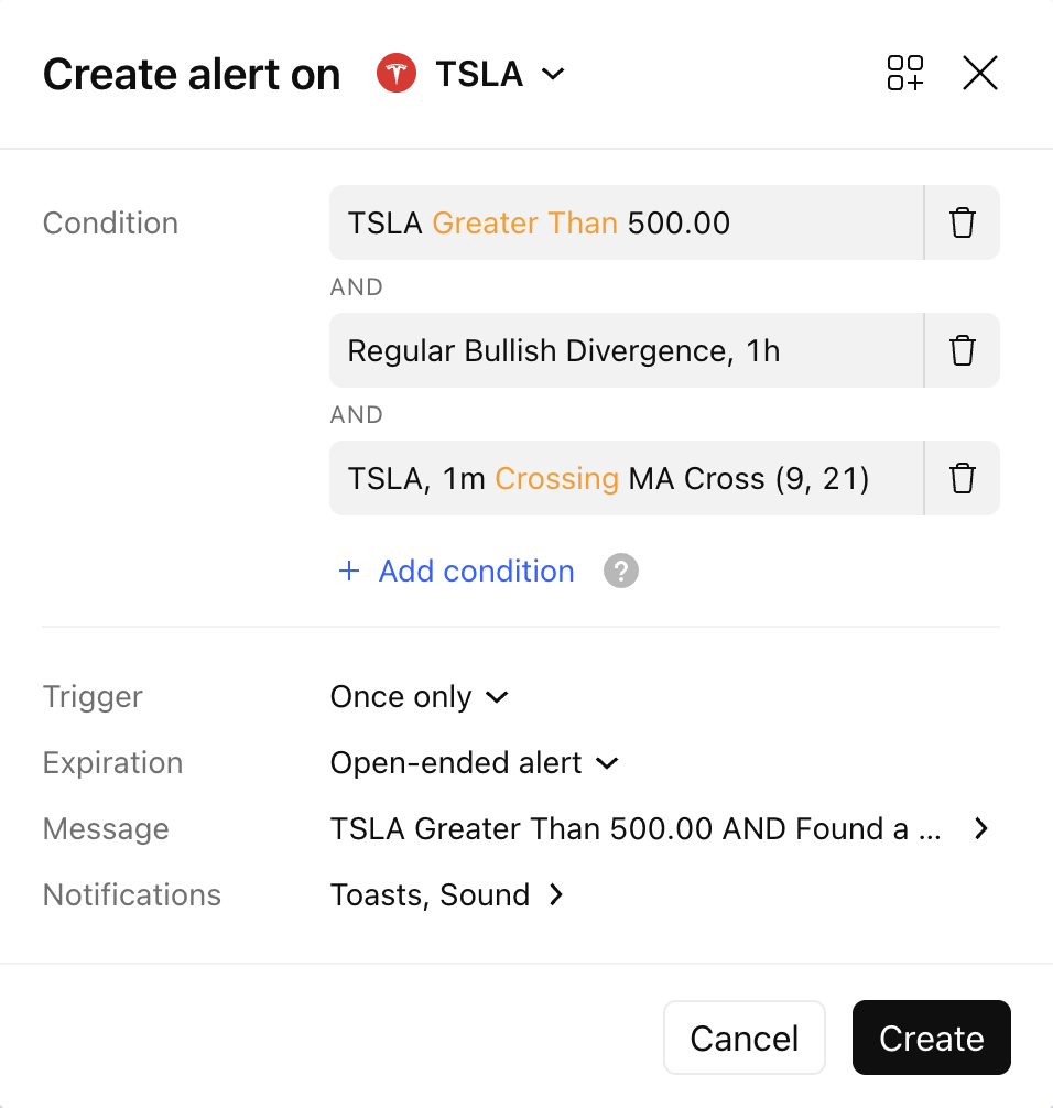 여러 조건을 동시에 확인하는 얼러트를 생성하세요 — 단 한 줄의 코드도 작성하지 않고 더 스마트하고 정밀한 신호를 받을 수 있습니다. 이 기능을 사용하면 가격, 차트 패턴, 지표 등 최대 다섯 가지 조건을 하나의 강력한 얼러트로 결합할 수 있습니다. 모든 조건이 동시에 충족될 때만 얼러트가 발동됩니다.