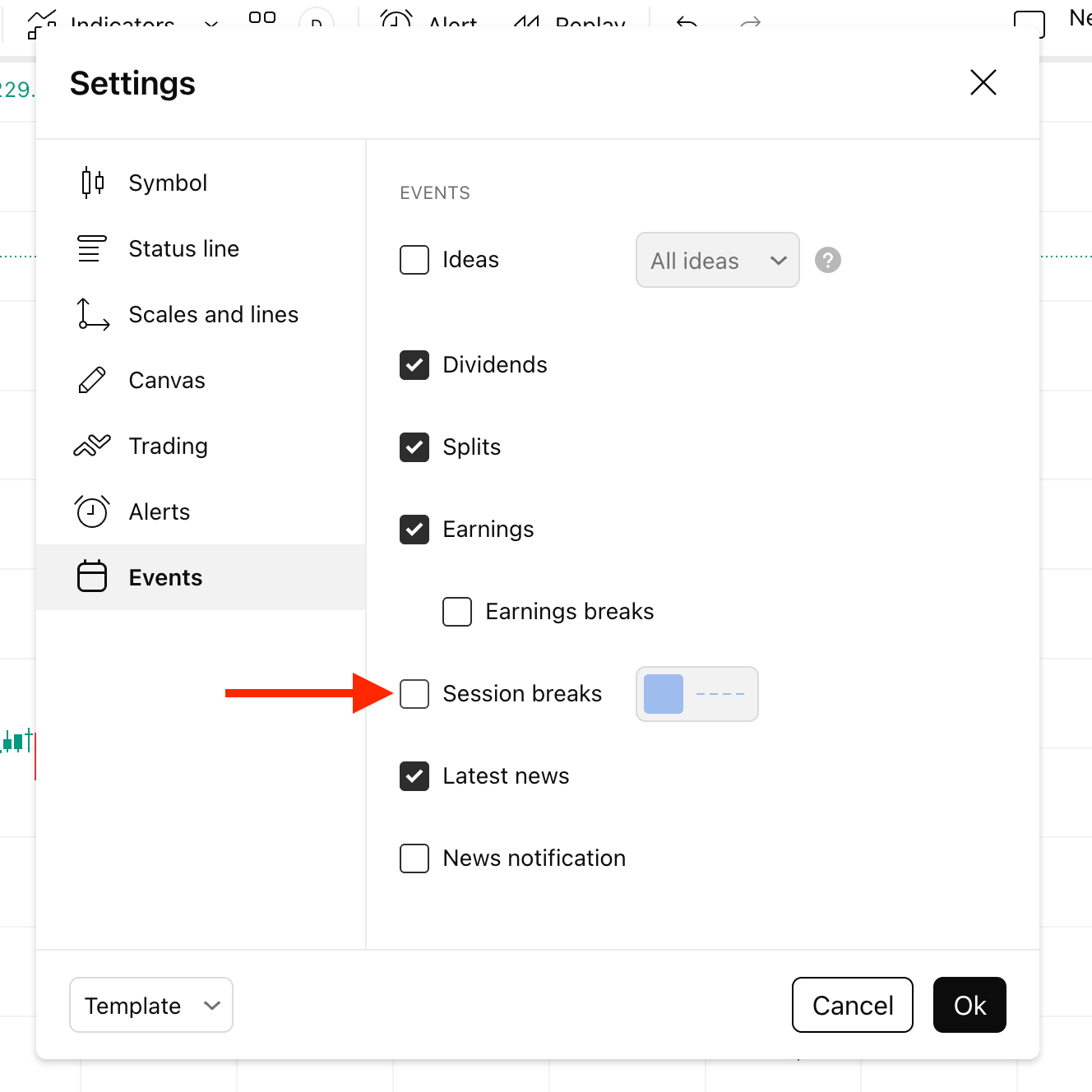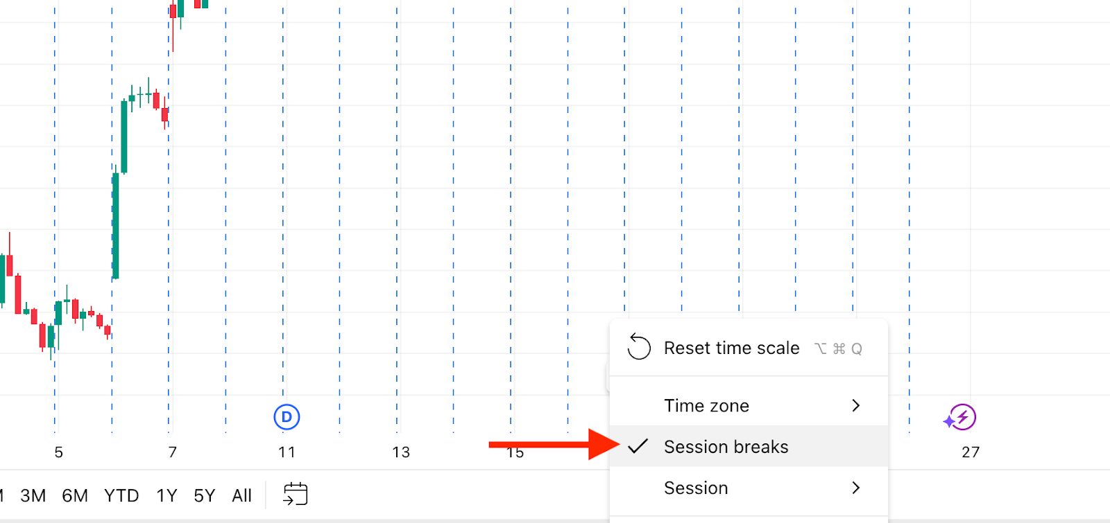 차트에서 파란색 수직선을 없앨 수 없습니다인트라데이 차트의 파란색 수직선은 세션 브레이크를 나타냅니다. 이벤트 설정에서 표시를 비활성화할 수 있습니다:또는 시간 눈금의 마우스 오른쪽 버튼 컨텍스트 메뉴에서도 할 수 있습니다:더 오래된더 오래된메인 페인으로 인디케이터를 이동하는 방법다음다음연장 세션 가격 라인을 어떻게 표시하나요?슈퍼차트 시작