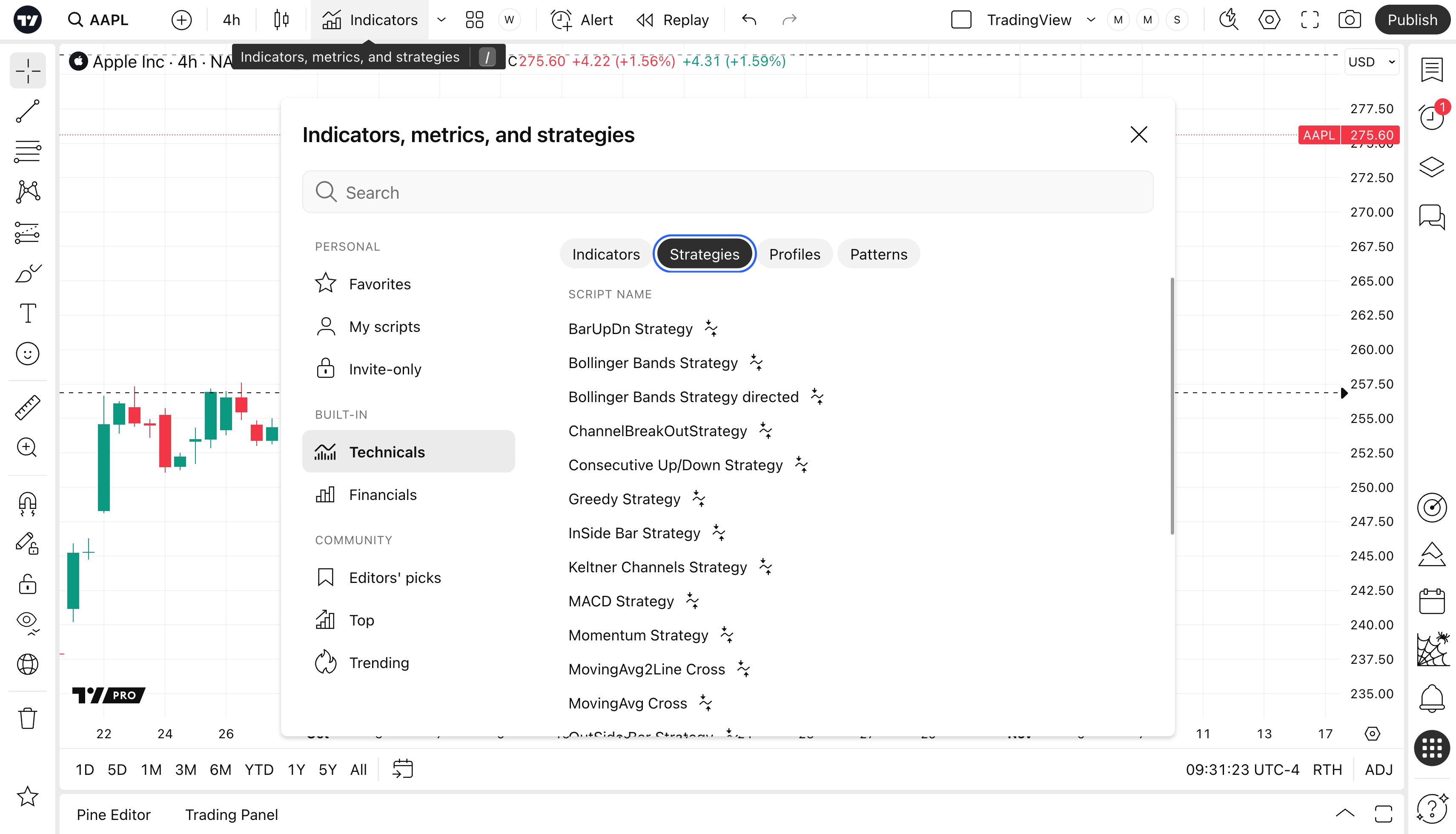 To create an alert for a strategy, you need to select one in the "Indicators, metrics, and strategies" window. There, open the "Technicals" tab, and select "Strategies."