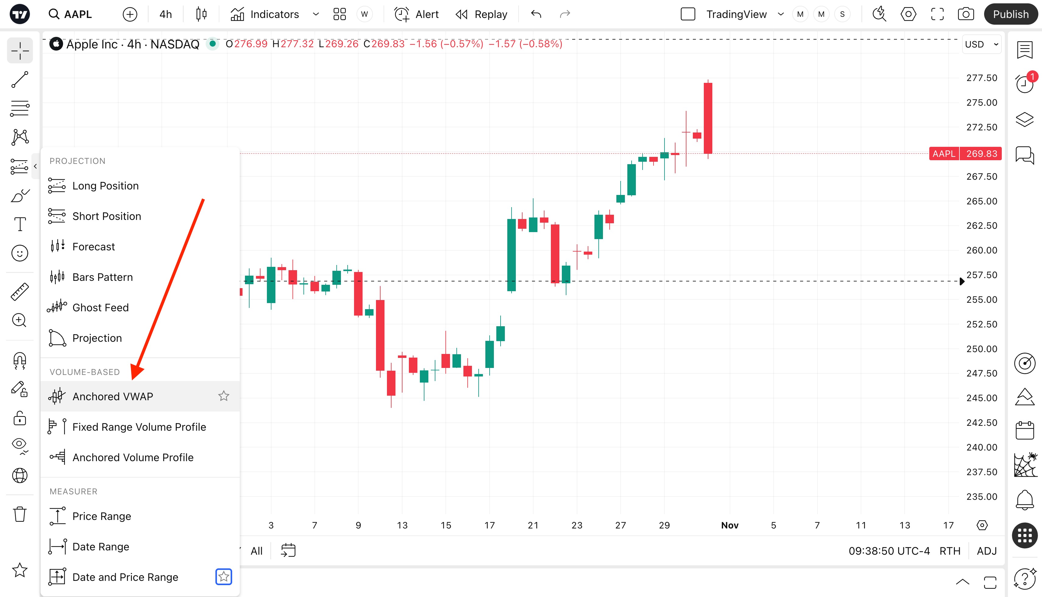 고정 VWAP는 왼쪽 툴바의 “예측 및 측정 도구”에서 찾을 수 있습니다.