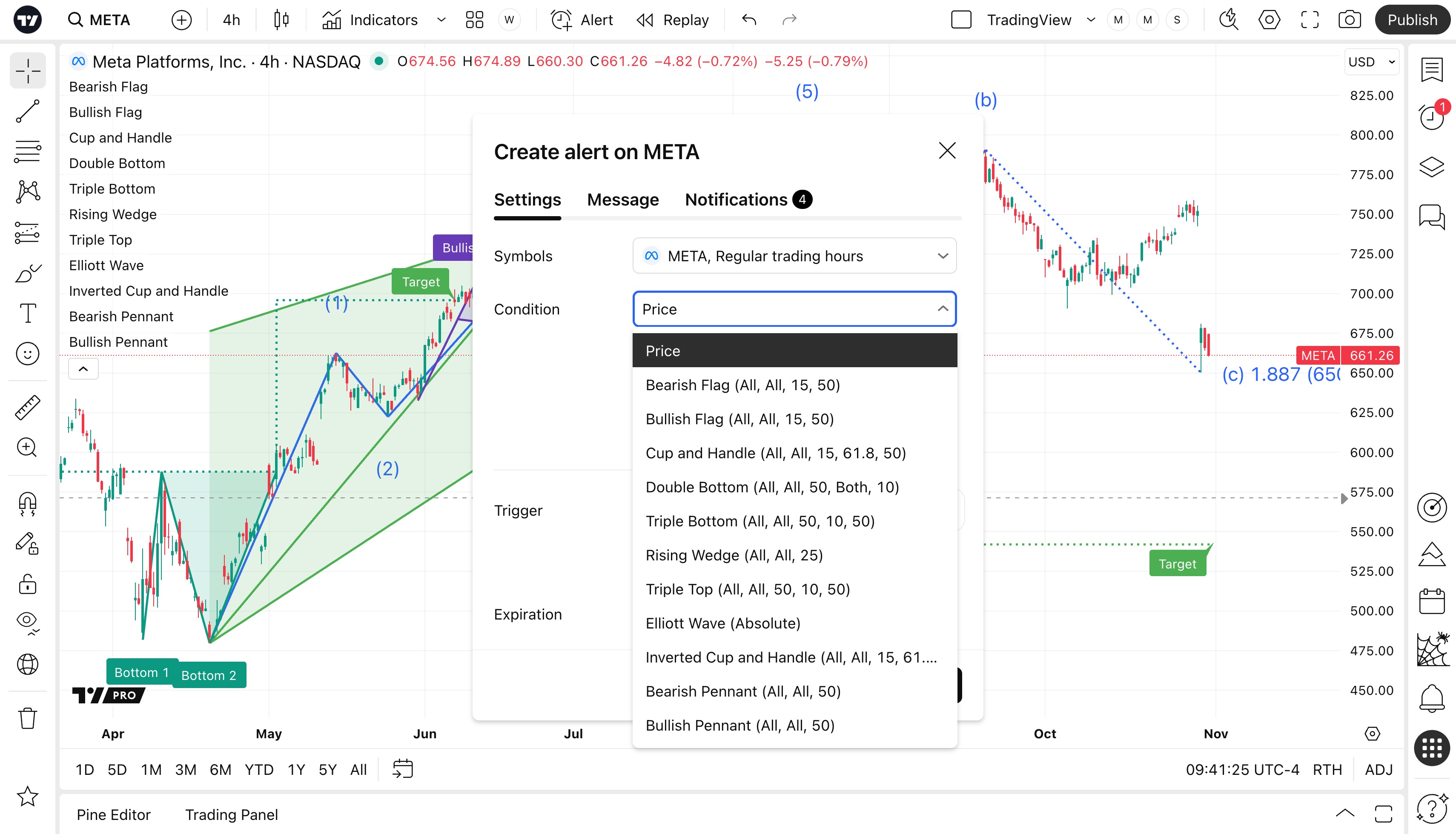 You can set alerts for automatically detected chart patterns. These alerts identify pattern breakouts, recognize new formations, and notify you about a pattern reaching its target.