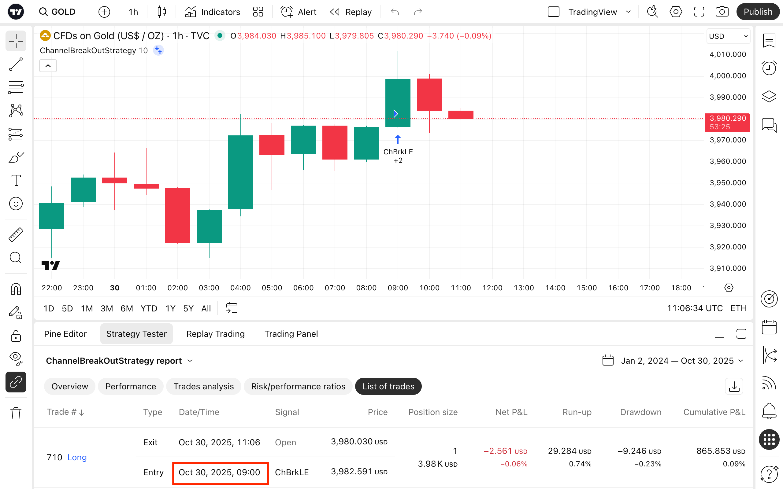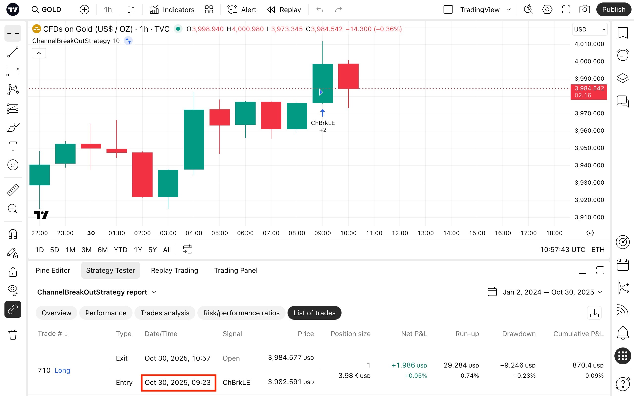 페이지를 새로고침(F5)하면 전략 테스터의 정확한 체결 시간이 바 오픈 시간인 UTC 09:00으로 바뀌게 됩니다. 따라서 얼러트가 제시간에 트리거 되었음에도 23분 늦은 것처럼 보일 수 있습니다: