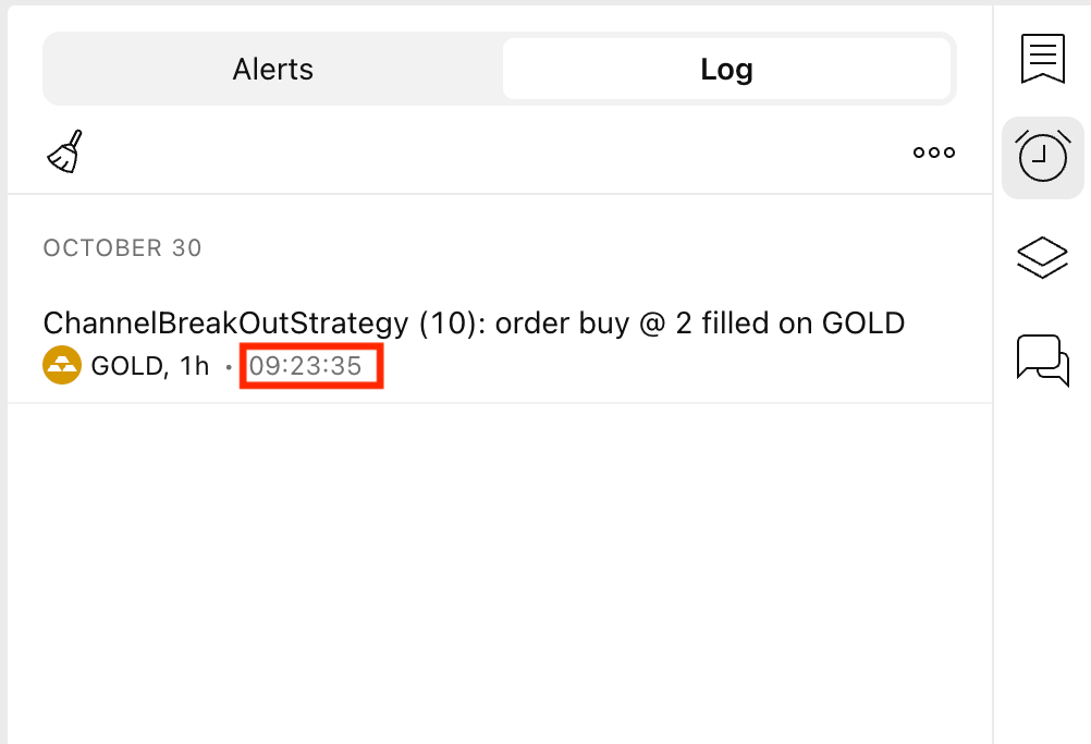 얼러트는 항상 발생된 정확한 시간을 표시합니다(전략 얼러트의 경우, 이는 해당 주문이 실행된 시간과 동일합니다).
