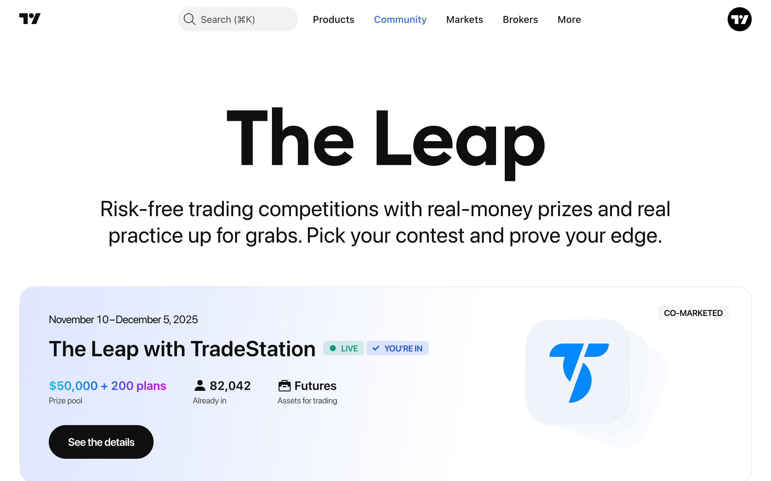 The Leap은 TradingView의 정기적인 페이퍼 트레이딩 대회입니다. 실제 시장 실행을 반영하지만 실제 돈 대신 가상 자금을 사용하는 특별한 페이퍼 트레이딩 계정을 통해 시뮬레이션 계정으로 실제 시장 조건에서 거래 기술을 테스트할 수 있습니다.