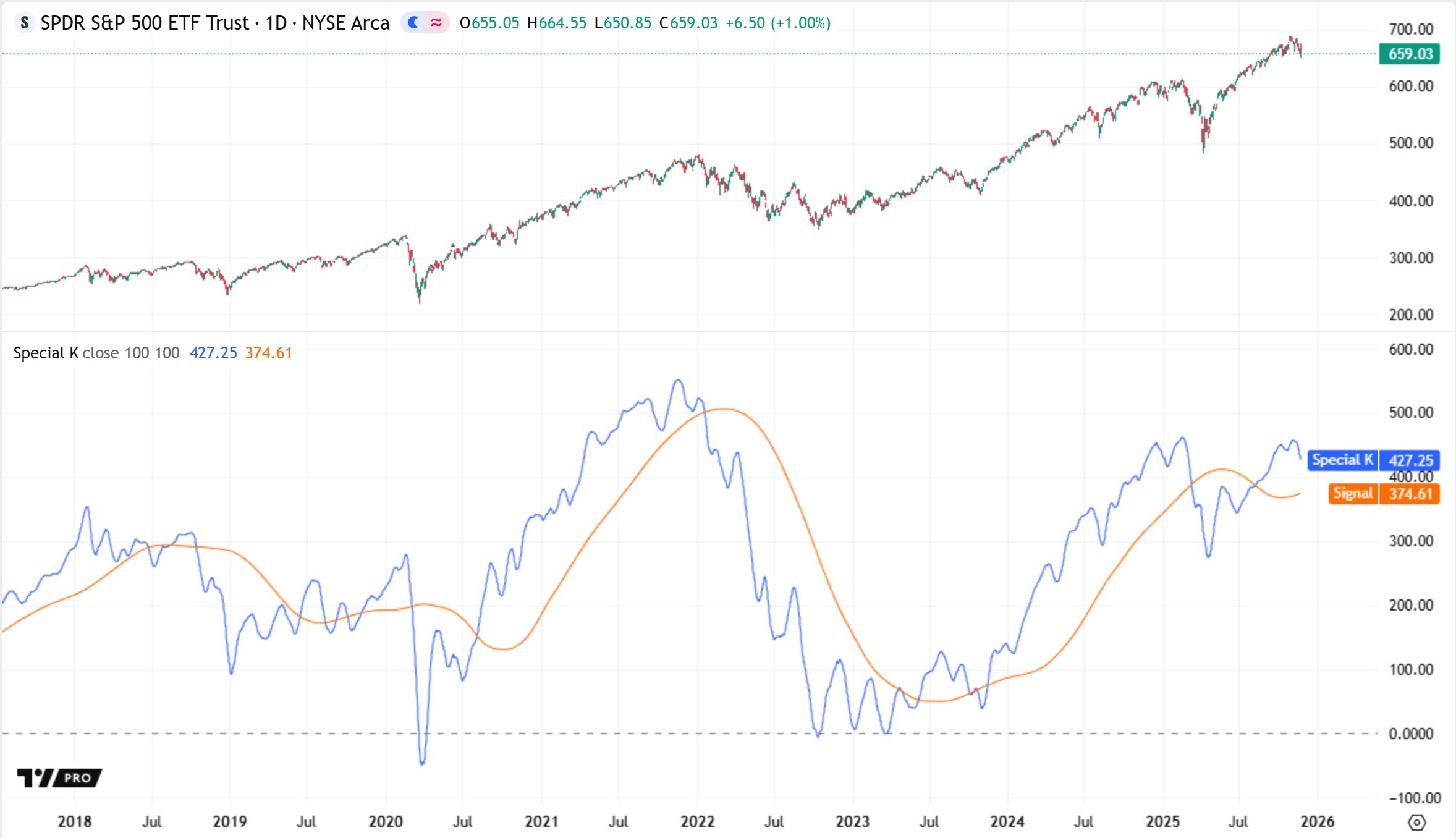 스페셜 K는 마틴 J. 프링이 개발한 추세 및 모멘텀 인디케이터로, 다양한 기간의 평균 변화율을 단일 오실레이터로 통합하여 단기, 중기, 장기 가격 주기에 대한 필터링된 복합적 시각을 제공합니다. 노우 슈어 씽 인디케이터(KST)의 개념과 수년간의 시장 관찰을 바탕으로, 프링은 주요 추세와 반전을 식별하고 단기 추세 추종 거래의 타이밍을 돕기 위해 스페셜 K를 설계했습니다.