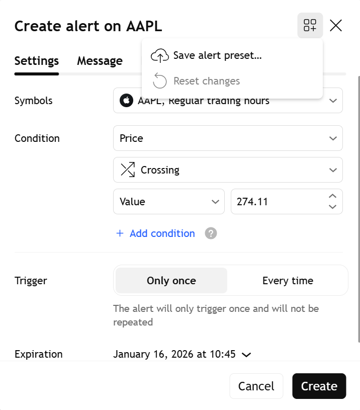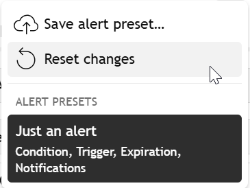 얼러트 프리셋을 사용하면 얼러트 구성을 템플릿으로 저장하여 다양한 심볼이나 조건에 빠르게 적용할 수 있습니다. 매번 동일한 얼러트 매개변수를 수동으로 설정하는 대신, 프리셋을 한 번 생성하면 클릭 한 번으로 재사용할 수 있습니다.